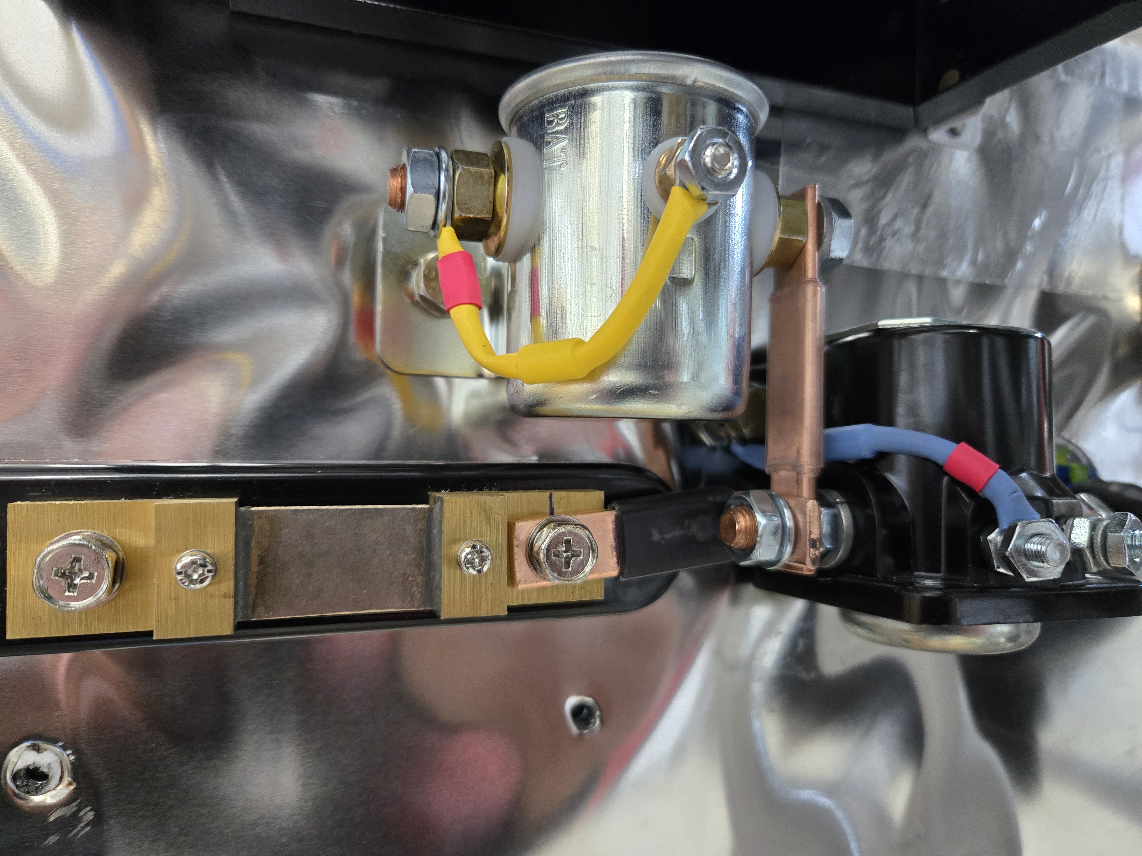 I did a little more work on the electrical portion of the FWF. I ordered some 1/8" copper bar and split it to about 1/2" wide chunks to make the connections between the solenoids and other power related bits and pieces. The starter solenoid to amp shunt took a little zig zagging and step offsets to fit. Yet another lesson in airplane building - if you have the room, go ahead and spread things out. I tried to keep everything fairly close together because I wanted to leave room around the engine mount, but I probably should have given myself a little more space.